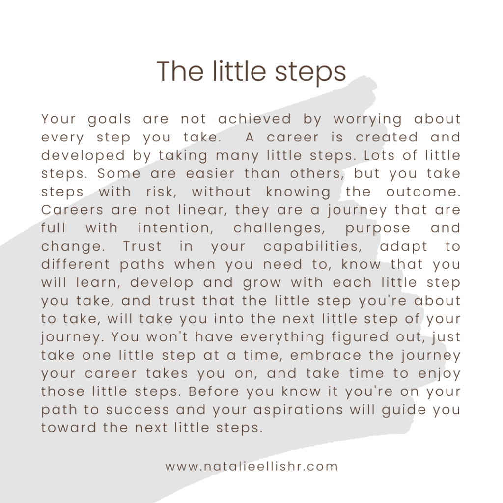 Many people find themselves constantly worrying about every step they take, fearing they might make the wrong move, they’ll make mistakes or that they won’t be seen in a particular way. I wanted to write this blog as a reminder that a successful career is not built solely on meticulous planning or complicated strategies, but rather on a series of small steps taken with intention, adaptability, and trust in your own abilities.